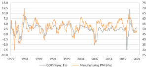 Chart 1: The manufacturing PMI has rebounded closer to 50. 45 indicates recession.