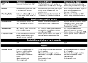 We have built 3 separate scenarios – Recession, Extended Cycle, and Productivity Boom, to help assess market pricing relative to the scenarios. We think Recession and Extended Cycle are more likely.